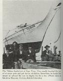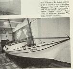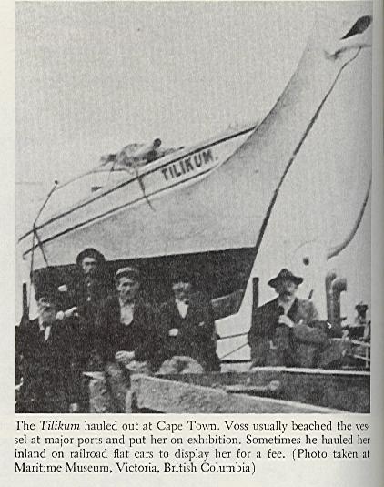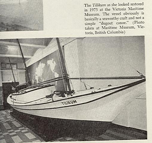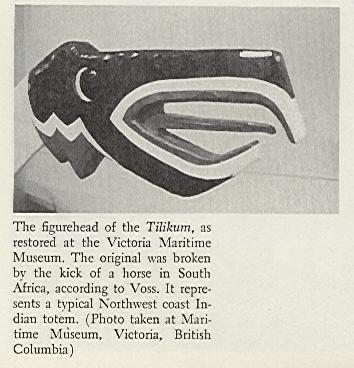 The Tilikum? After she arrived in England on September 2, 1904, she was exhibited for a time, and then left to rot on the Thames mud flats for twenty years or so. In 1928, a group of British naval officers found the derelict ship with the help of the National Museum at Greenwich, the Victoria Publicity Bureau, and various yachting magazines. The canoe was then in the possession of two brothers, E. W. and A. Bydord, who agreed to give it to Victoria on the condi- tion that Tilikum never be exhibited for financial gain. She was trans- ported to British Columbia and restored by the Thermopylae Club and public donations. Since June 8, 1965, Tilikum has been on display at the Maritime Museum in Victoria. The figurehead, which had been damaged by a kick from a horse in Pretoria, has been restored, as have other parts, exactly the way it was when Voss and Luxton sailed her.